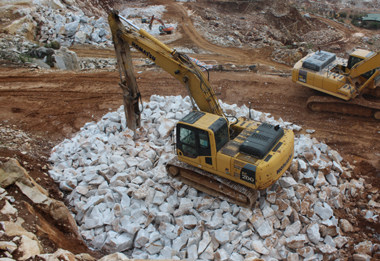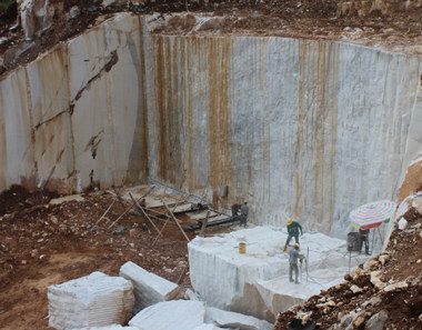 圖3結(jié)構(gòu)完整的大理石礦,被工人在山上就地切成塊狀,運到山下通過圓盤鋸的切割,制成天然大理石板材。