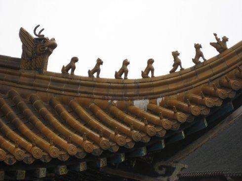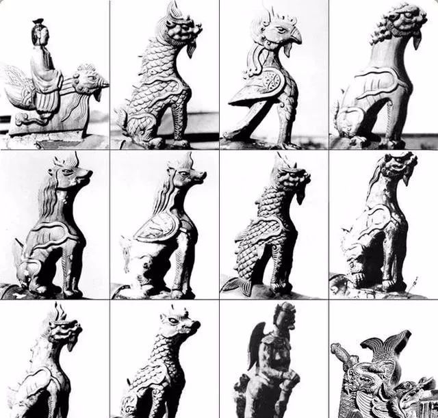 如果到過故宮的話,會看到屋宇的房脊、飛檐上大都有幾個極小的雕塑,或為人形,或作獸狀。其實不止故宮,一些貴戚官宦的故居也有與之類似的裝飾,這些就是“五脊六獸”在建筑中的現(xiàn)實形態(tài)。中國古代傳統(tǒng)屋脊建筑樣式中,起脊的硬山式、懸山式和廡殿式建筑共有五條脊,分別為一條正脊和四條垂脊。正脊兩端有龍吻,又叫吞獸。四條垂脊排列著五個蹲獸,便統(tǒng)稱為“五脊六獸”。