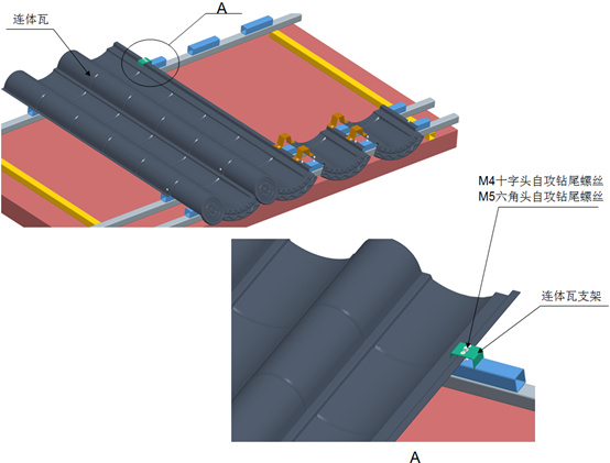 注:2、連體瓦支架與連體瓦由兩個M4十字鉆尾絲連接固定。
