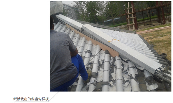 1、根據(jù)現(xiàn)場的安裝情況如圖所示先用紙板裁出斜當勾樣板,比對樣板與屋面瓦間隙控制在3mm以內(nèi);