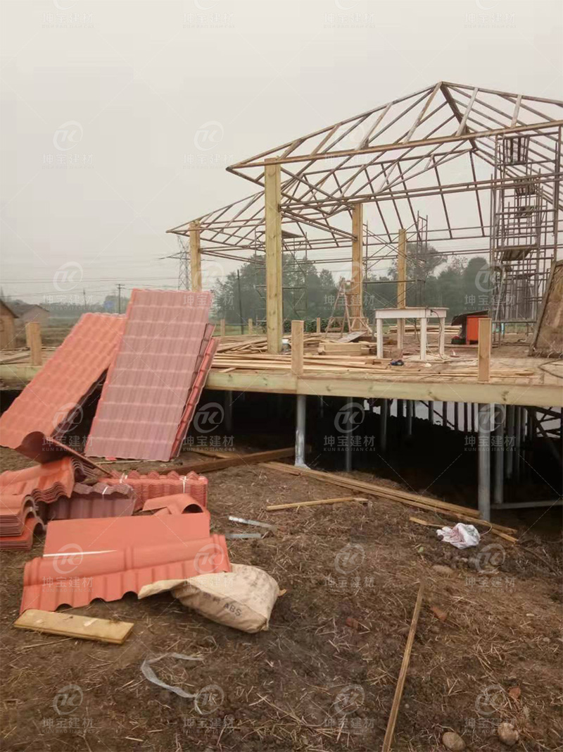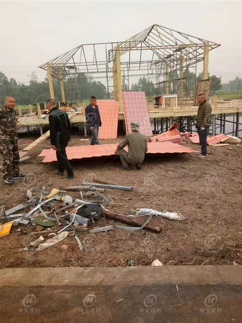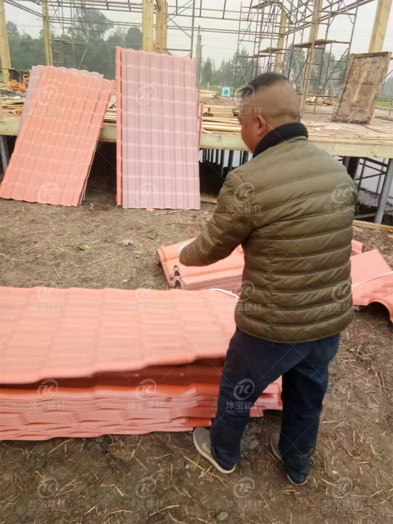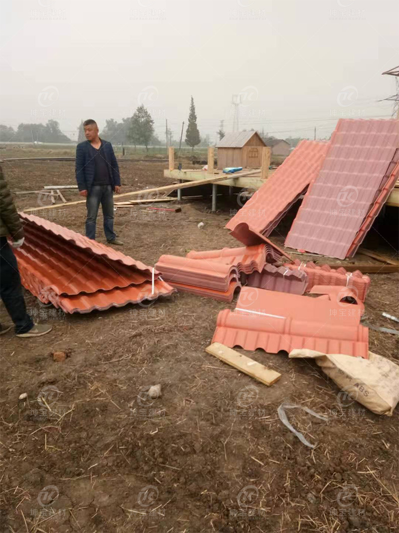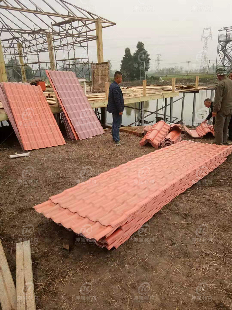 大邑度假村項(xiàng)目的接待室采購合成樹脂瓦用作屋面瓦,采購商是大邑潤地農(nóng)業(yè)有限公司,采購清單300米,橘橙色,3.0MM厚樹脂瓦,屋面整體采用的是防腐木做支撐。