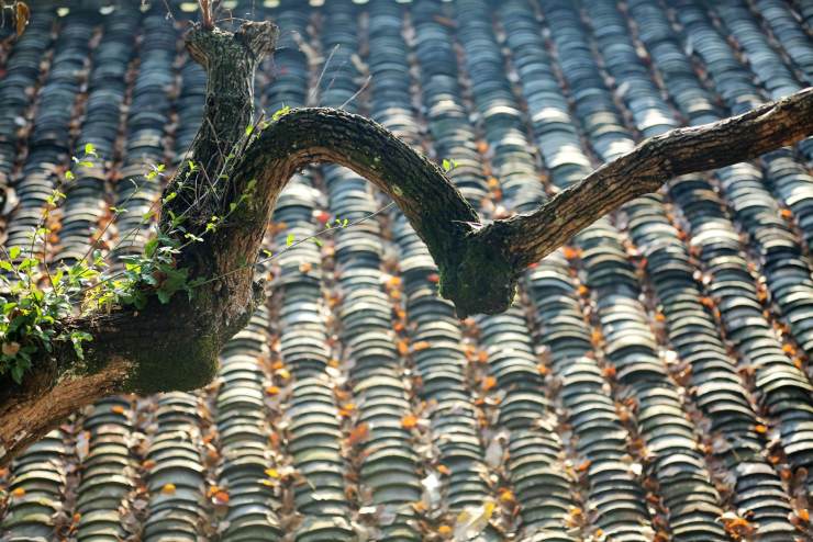 單說用量多寡,小青瓦當(dāng)屬老大,她還有個(gè)美麗的別名蝴蝶瓦,又名陰陽瓦,廣泛應(yīng)用在屋宇建筑上,江南江北身影重重。江西婺源人家屋頂黛色板瓦,因著大塊艷麗秋色,華美跳躍。六和塔下房屋間逸出一叢芭蕉,不知是瓦因著芭蕉清新,還是芭蕉因著青瓦含蓄。秋至皖南,人家的房頂落葉覆蓋,雨過天晴水汽縈繞恍惚出水墨顏色。靜升王家單色青瓦覆頂,不著異色卻整整當(dāng)?shù)闷鹈耖g故宮名頭。甪直古鎮(zhèn)青磚小瓦馬頭墻,隱含著書香門第的典雅。河街并行的婉約水鄉(xiāng),那屋瓦也文靜靈秀款款深情。年幼時(shí)膠東老家的青黛小瓦,比著當(dāng)下張揚(yáng)的大紅瓦多了古遠(yuǎn)深邃跟幽謐。