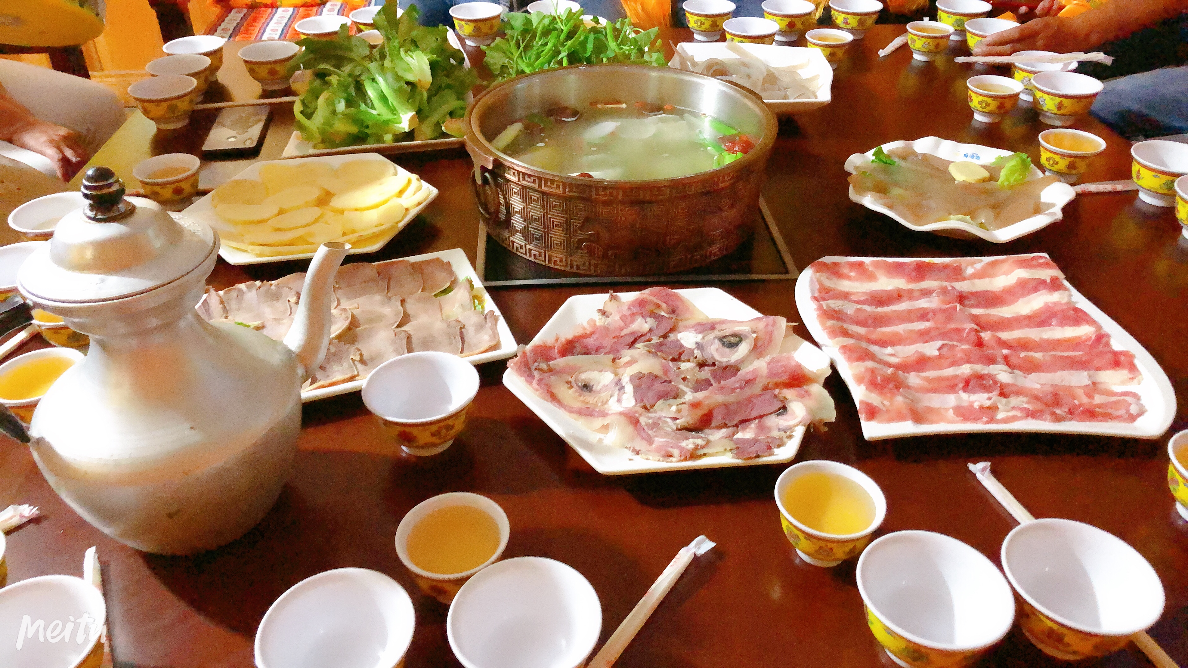 傍晚,來到磨西古鎮(zhèn)享用當(dāng)?shù)夭夭?。沒有了四川火鍋的爽辣與油膩,藏式火鍋的湯底色澤清亮,微微泛著奶白色,因?yàn)闇资怯藐笈9穷^敖制而成。