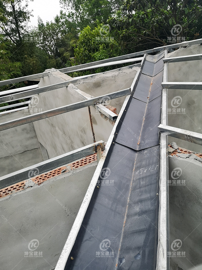 這是人字坡兩面流水屋面,L形狀的建筑,中間接縫處就會用到V型水溝,進行排水作用,水溝瓦固定在鋼結構上就可以咯!非常簡單。