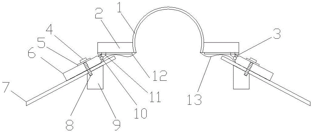 3.根據(jù)權(quán)利要求1所述的一種asa合成樹脂瓦(正脊瓦)連接結(jié)構(gòu),其特征在于:兩個(gè)所述連接塊(6)朝內(nèi)一側(cè)的底端均設(shè)置有防水膜(13)且兩個(gè)防水膜(13)的另一端分別與安裝座(1)的底端兩側(cè)固定連接。
