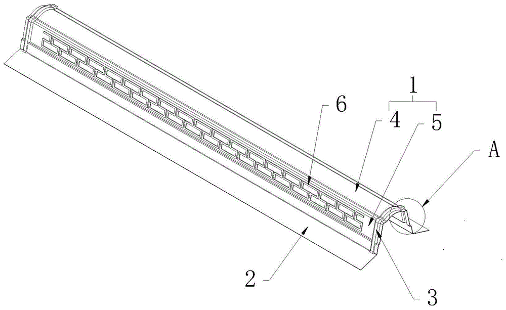 本實用新型設置凸棱3進行限位搭接,正脊瓦、三通瓦與本實用新型之間的搭接部分無需采用螺絲等固件進行固定,可減少螺絲用材,還能提高安裝效率;另外,脊瓦部1分成位于中部的拱形部4和連接在拱形部4兩側(cè)的裝飾部5,合成樹脂材質(zhì)的拱形部4結(jié)構(gòu)可保證本實用新型具有足夠的支撐強度和一定的彈性形變能力,在實際安裝時,根據(jù)配合需求或誤差原因,拱形部4需要略微張開或收緊以進行安裝調(diào)整,以匹配具體斜梁結(jié)構(gòu)、傾斜度進行安裝,連接在拱形部4兩側(cè)的裝飾部5可擴大改調(diào)整范圍的極限值,可有效避免拱形部4折損的情況,并提高本實用新型的適用范圍;此外,裝飾部5搭在斜脊側(cè)面,用戶可在戶外直接觀察到裝飾部5外表,裝飾部5設置仿古紋路6能糅合古典文化和現(xiàn)代材料工藝,展現(xiàn)文化遺產(chǎn)的推陳出新。