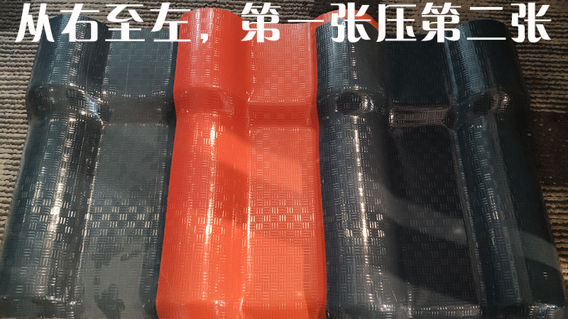 方法一:固定**張合成樹脂瓦之后,安裝第2張樹脂瓦的時候,要插放在第1張合成樹脂瓦的下面,這樣操作瓦基本不會讓第二張樹脂瓦往下移。