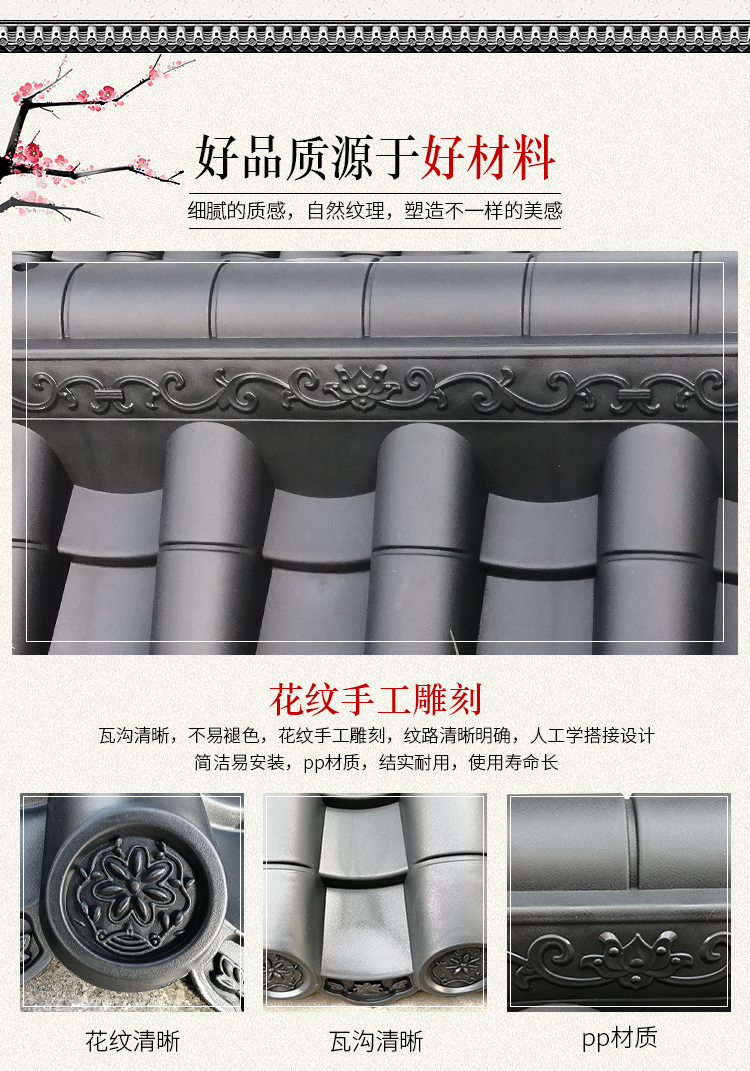 毫無疑問,仿古一體瓦是由PVC聚乙烯加ASA,再輔助工具加上增稠劑,阻燃劑,及其CPE,ACR等原材料,及其小量碳酸鈣粉提升抗壓強(qiáng)度。這里邊的配制尤為重要。原料的成本費(fèi)不一,占比不一,價錢天差地別!四、水電工程人力成本:地域不一樣,人工成本不一樣,其實(shí)大伙兒都明白,相距個幾毛甚為一切正常!五、樹脂粉價錢:聚氯乙烯樹脂粉銷售市場上價錢有好壞。一些逃避責(zé)任的生產(chǎn)廠家甚至是很多應(yīng)用再造PVC顆粒料生產(chǎn)制造水泥瓦,價錢相差太大可見一斑!