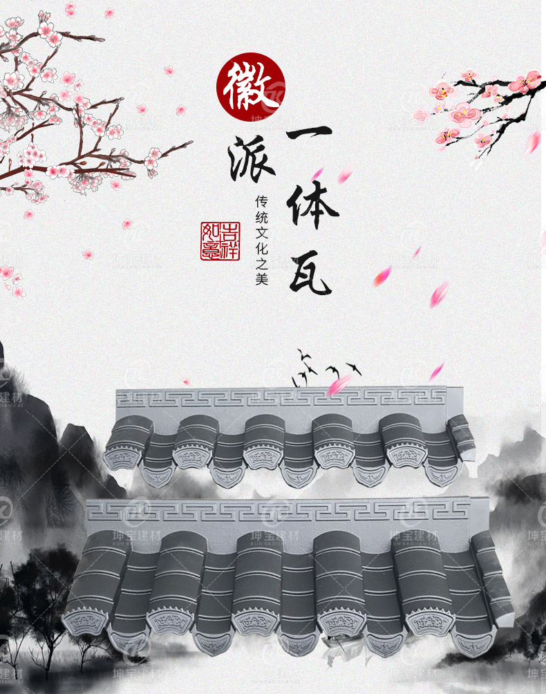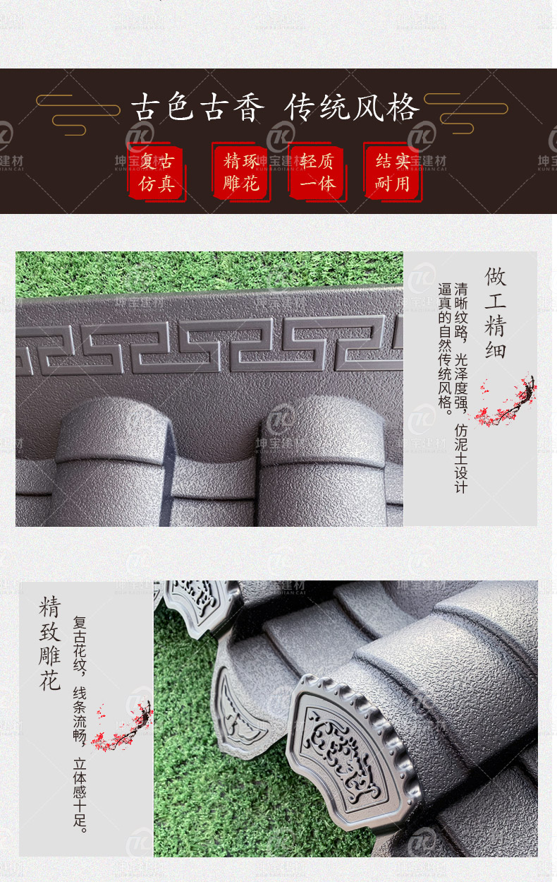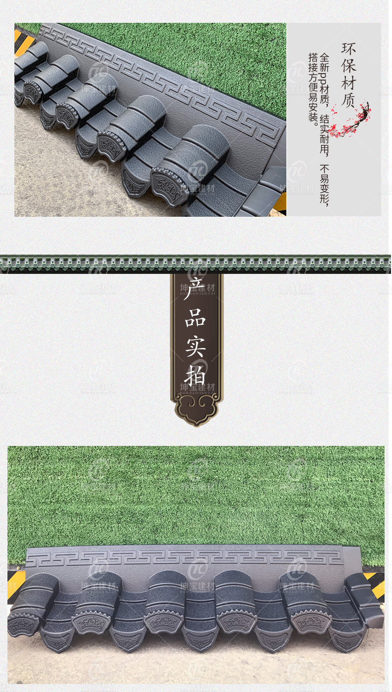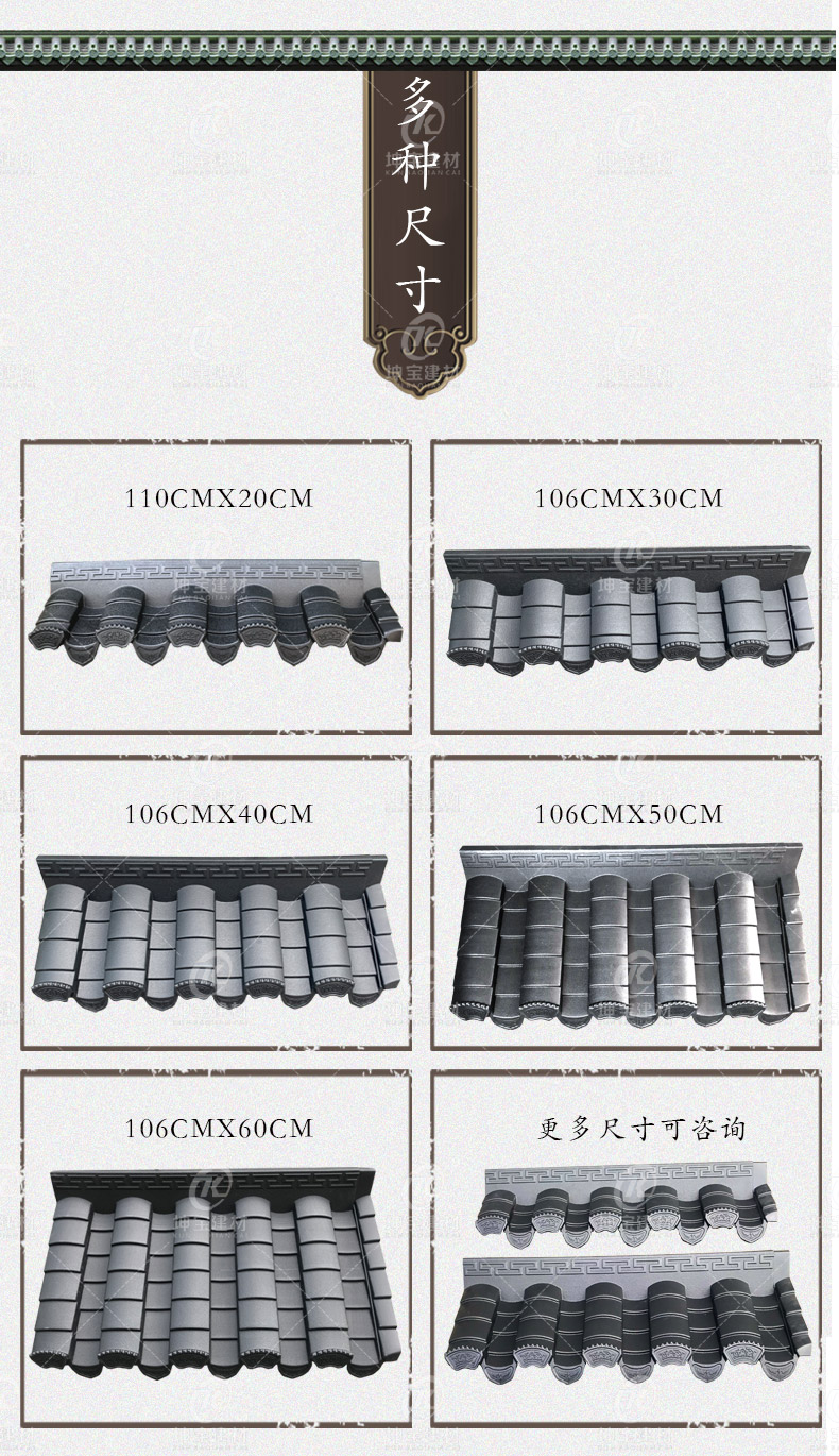 用途:徽派建筑裝飾(室內(nèi)外皆可用)圍墻、門頭、徽派古建筑、徽派小瓦